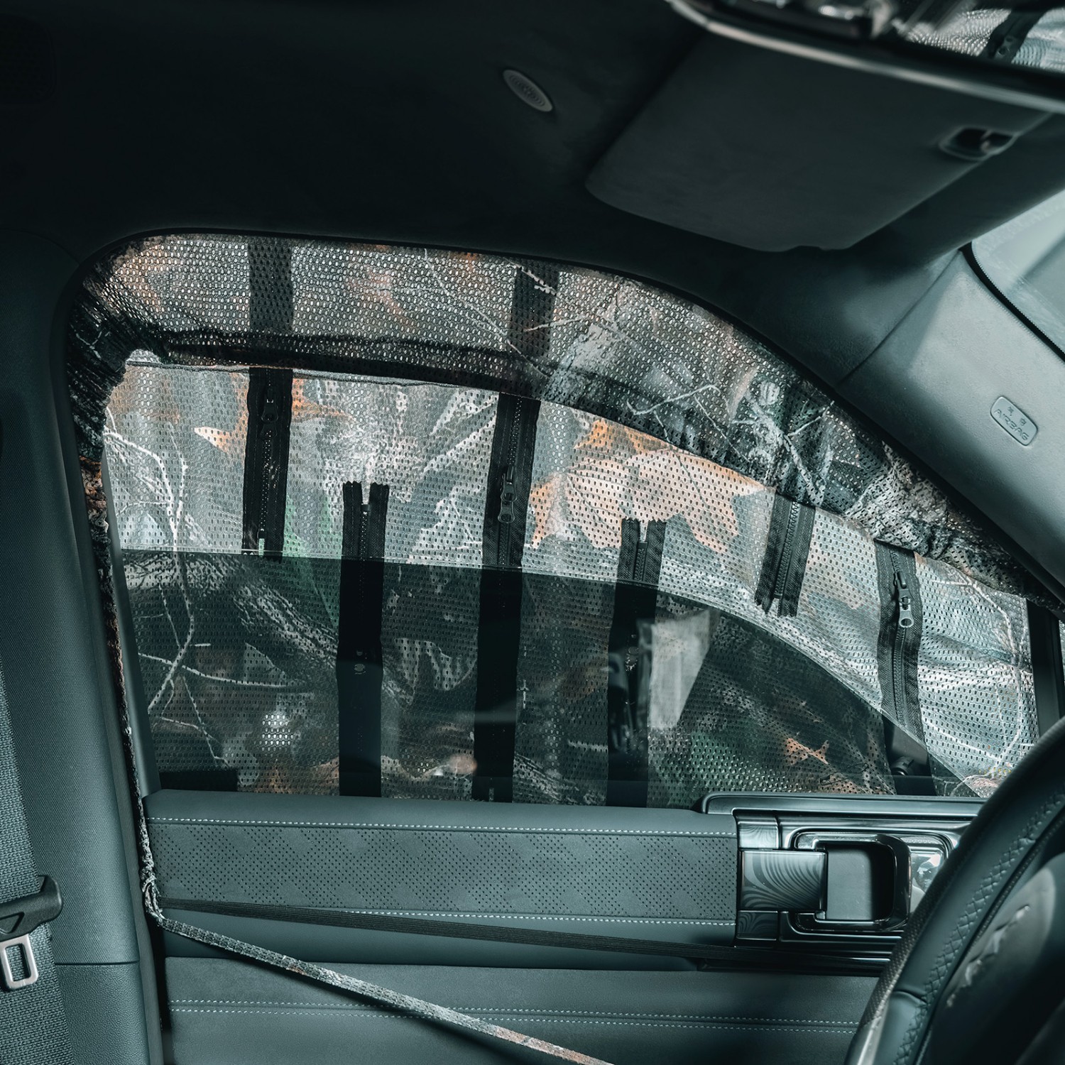 Více směrových zipů umožňuje rychlý přístup k pozorovacím okénkům, takže můžete sledovat okolí, aniž byste museli záclonu sundávat. Konstrukce umožňuje plnou pohyblivost oken, takže můžete snadno regulovat větrání v extrémním horku nebo chladu. Speciální výřez pro zpětné zrcátko zajišťuje výhled při řízení, takže můžete zůstat mobilní, aniž byste museli záclony sundávat.