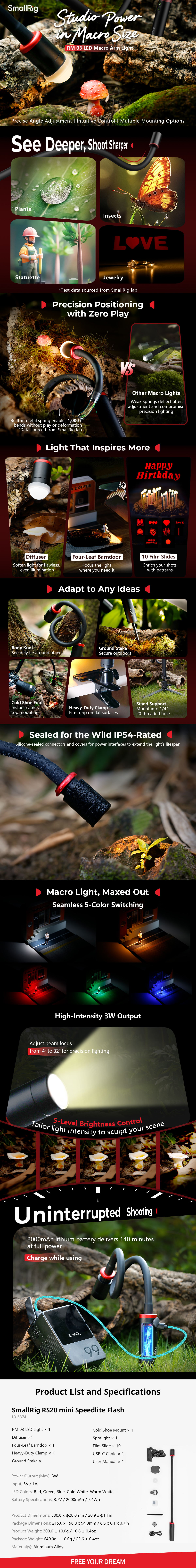 RM 03 je speciální LED světlo určené pro makrofotografii. Jeho robustní integrovaná kovová pružina umožňuje snadné nastavení úhlu osvětlení. Dodává se s příslušenstvím pro ovládání světla, včetně difuzoru a čtyřlisté klapky, spolu s univerzálními možnostmi upevnění, jako je odolná svorka a zemní kolík, které poskytují bezkonkurenční flexibilitu. Díky odolnosti proti povětrnostním vlivům podle normy IP54 a pěti výkonným 3W LED diodám, které podporují vícebarevný výstup, inspiruje RM 03 k neomezené a dlouhotrvající (až 140 minut provozu) kreativitě v makrofotografii.