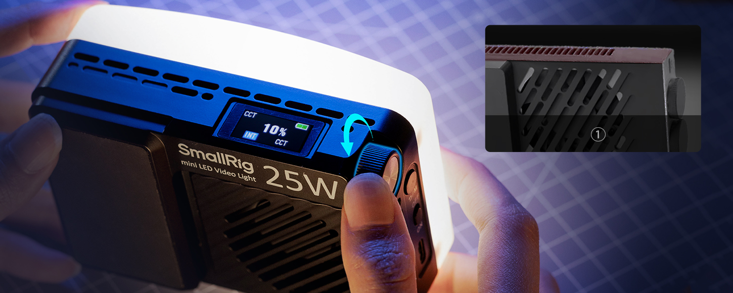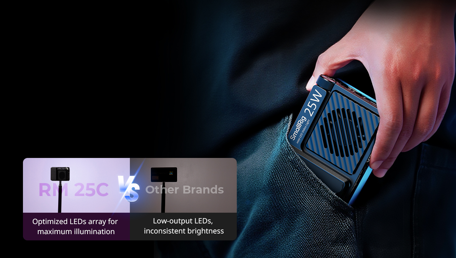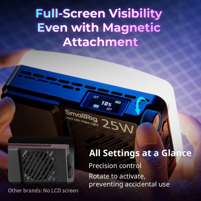 Kompaktní, ale výkonný: Rozměry 113 x 74 x 29 mm (4,4 x 2,9 x 1,1"), hmotnost 255 g, působivý jas 3070 luxů @0,5 m (5600K) s výkonem 25 W, ideální pro vlogery, outdoorové fotografy a zejména pro sólové tvůrce.