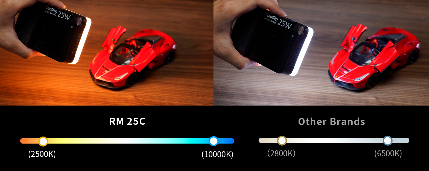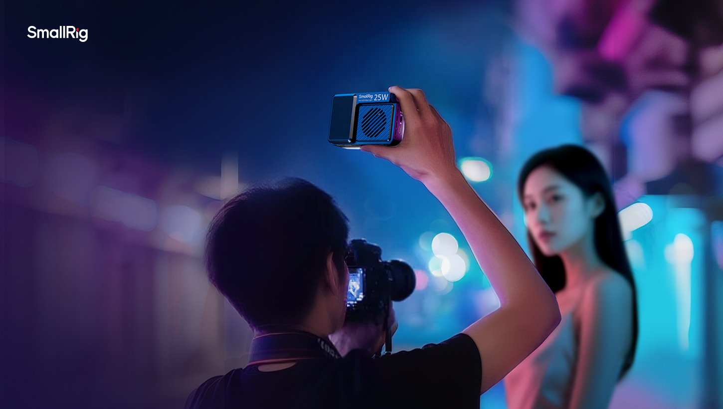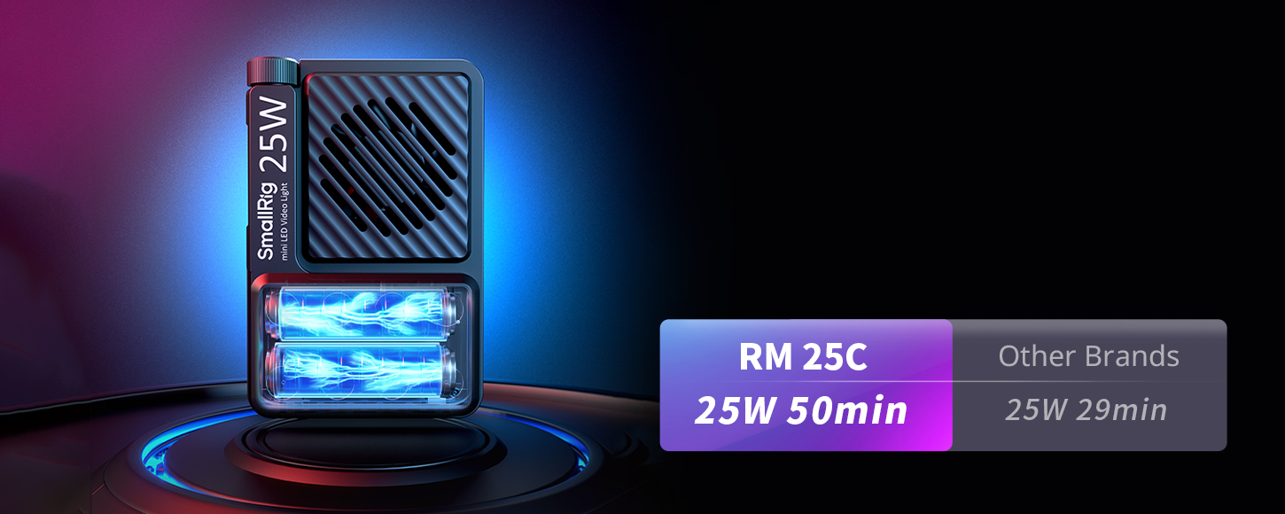 SmallRig RM 25C mini LED video světlo s integrovanou baterií. Všestranné osvětlení RGB+CCT: Nastavitelná teplota dvou barev od 2500K do 10000K, více než 36 000 barev a 14 vestavěných světelných efektů. Ideální pro fotografování zátiší, jídla a kreativní portrétní osvětlení.