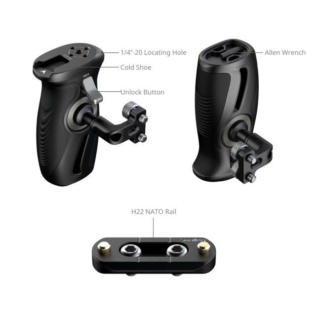Otočná boční rukojeť se šrouby 1/4"-20 5194 je vybavena možností otáčení o 360° jedním dotykem pro plynulé nastavení úhlu během fotografování. Nabízí všestranné možnosti rozšíření díky několika montážním rozhraním, včetně polohovacích otvorů 1/4"-20 pro dálkové ovladače (ID 3902) a magická ramena (ID 3873), jakož i držáku cold shoe pro příslušenství, jako jsou držáky monitorů (ID 2905B), mikrofony (ID 3487), videosvětla (ID 3286B) a mikrofon DJI Mic 2.