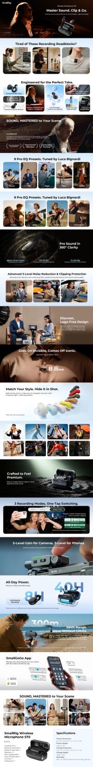 Bezdrátový mikrofon SmallRig S70-A (All-in-One) (černý) 5714 je určen pro tvůrce obsahu a streamery, kteří pracují s více zařízeními. Je ideální pro širokou škálu scénářů, včetně živého streamování, každodenního vlogování, produkce krátkých videí, natáčení cest a rozhovorů.