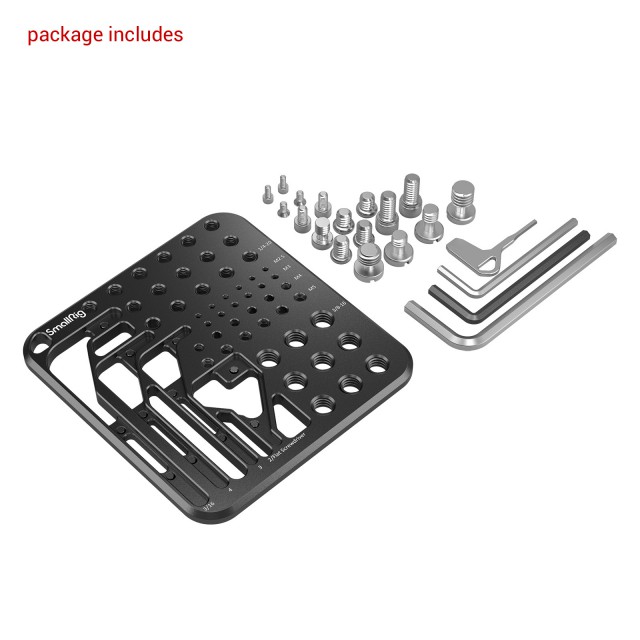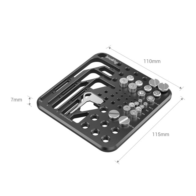 Deska pro uložení šroubů a šestihranných klíčů SmallRig MD3184 je určena pro běžně používané šrouby a šestihranné klíče kamerových souprav. Jedná se o úložnou desku obsahující 4 šestihranné klíče (3/16、3、4、2/plochý šroubovák) a různé šrouby, jako jsou 2 šrouby s plochou hlavou 1/4"-20, 8 šestihranných šroubů 1/4"-20 pro klece, L držáky, QR desky, základní desky, rukojeti, tyčové svorky, horní desky a monitory, 2 šestihranné šrouby M4 a 2 šrouby M5, 2 šrouby s oříznutou hlavou M3 pro montáž rozety, 2 šrouby M2.5 šestihranných šroubů používaných pro zajištění klece proti zkroucení a 2 šrouby s plochou hlavou 3/8"-16 pro QR desky a základní desky. Protizávitové ochrany dosahuje držením šestihranných klíčů pomocí magnetu a montáží šroubů na závitové otvory. Pro pohodlný a přesný přístup jsou na nich zřetelné laserem vyryté specifikační značky. Úložná deska se dodává s flanelovým a popruhovým otvorem pro snadné skladování a přenášení.