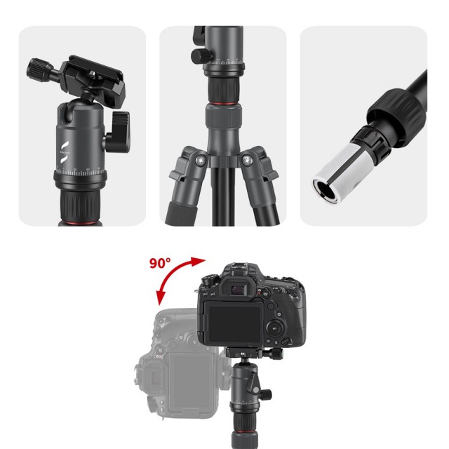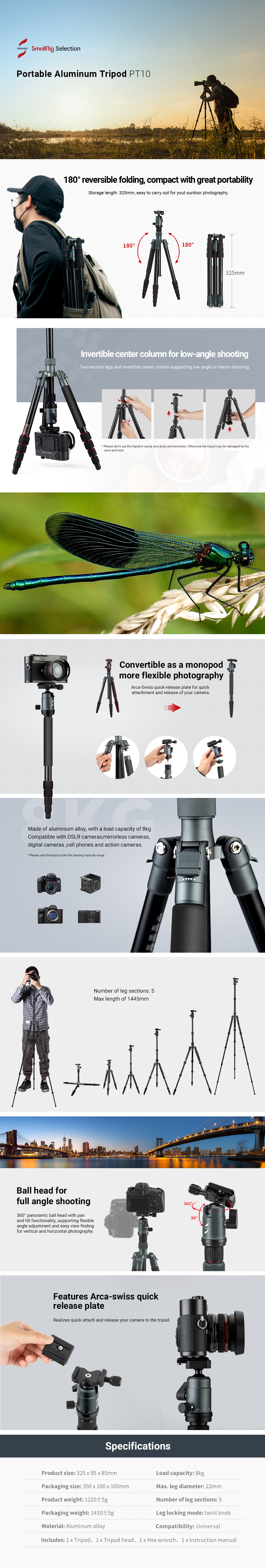SmallRig Selection Přenosný hliníkový stativ pro fotoaparát PT10 3257 je vyroben z hliníkové slitiny a má bezpečnou nosnost 8 kg. Stativ podporuje digitální zrcadlovky, bezzrcadlovky atd. Jeho pětisekční nohy zajištěné otočnými zámky umožňují maximální pracovní výšku 1445 mm a vynikající stabilitu. Je vybaven reverzním skládáním, které umožňuje realizovat délku složeného stativu pouhých 325 mm, což usnadňuje jeho přenášení. Jeho dvoudílný otočný středový sloup umožňuje pořizovat nízkoúhlové a makro snímky. Odnímatelný monopod přináší velkou flexibilitu. Stativ je vybaven kulovou hlavou, která podporuje panoramatické snímání, a rychloupínací destičkou typu Arca-Swiss pro rychlé přepínání mezi snímáním z ruky a ze stativu.