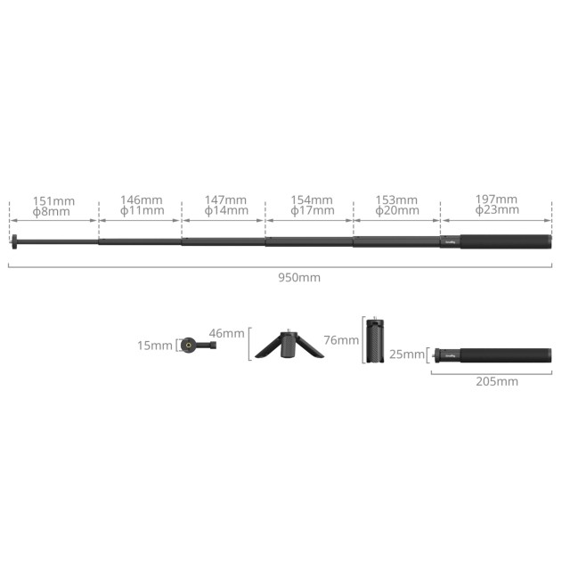 Selfie tyč SmallRig pro akční kamery 5403 obsahuje selfie tyč, svorku pro chytrý telefon, držák akční kamery, stativ a řemínek na zápěstí. Tato položka je vyrobena z hliníkové slitiny letecké třídy pro větší pevnost a odolnost a je vybavena šestihrannými výsuvnými částmi, takže se akční kamera nekroutí, a tudíž je stabilnější. Tato tyč kapesní velikosti, která se dá prodloužit až na 95 cm a složit na pouhých 20 cm, se dodává také s několika doplňky pro podporu chytrých telefonů a akčních kamer, jako jsou GoPro HERO13 Black, insta360 X5, DJI Action 5 Pro, AKASO. Zejména při použití kamery insta360 X4 můžete tyč z fotografií a videí vyjmout. Mezi příslušenstvím je řemínek na zápěstí, který pomáhá udržet tuto tyč a kameru bezpečně na vašem zápěstí, aby byla zajištěna bezpečnost; stativ, který má na horní straně jeden šroub 1/4"-20, připevníte k této tyči prostřednictvím jejího spodního otvoru se závitem 1/4"-20, abyste mohli pořizovat skupinové fotografie, pevné záběry atd.