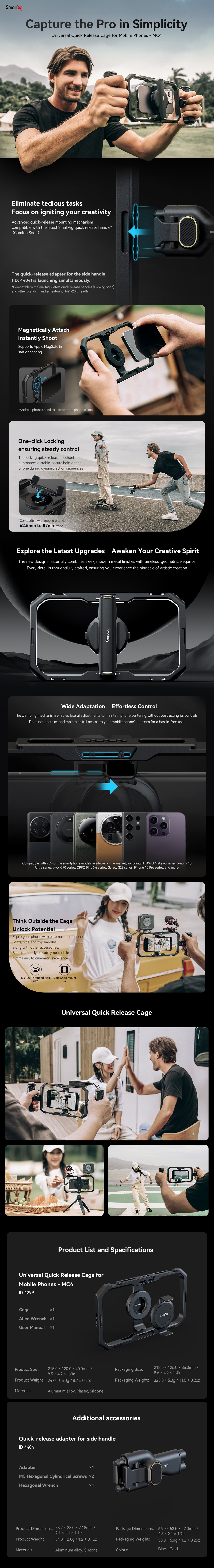 2. Určeno pro použití s univerzální rychloupínací klecí SmallRig pro mobilní telefon 4299 a klecí řady iPhone 15.