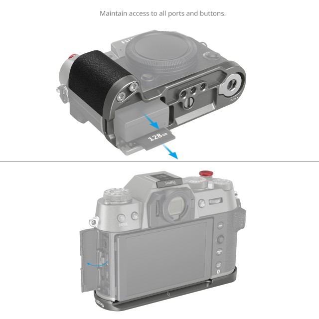 Silikonový grip SmallRig ve tvaru písmene L pro fotoaparát FUJIFILM X-T50 (Charcoal Silver) 4712 je navržen tak, aby zlepšil držení fotoaparátu. Grip ve tvaru písmene L se k fotoaparátu připevňuje pomocí šroubu 1/4"-20 ve spodní části a vestavěné silikonové podložky zabraňují poškrábání. Textura a barva gripu dokonale ladí s fotoaparátem FUJIFILM X-T50. Vestavěná rychloupínací základová deska Arca-Swiss umožňuje snadnou a rychlou montáž a demontáž stativu typu Arca. Čtyři otvory se závitem 1/4"-20 ve spodní části pro upevnění destiček a stativů typu Manfrotto. Drážka pro řemínek na zápěstí (ID: 3848). Vestavěný plochý klíč na spodní straně pro snadnou montáž a demontáž příslušenství. Grip je dodáván s exkluzivním krytem hot shoe s potiskem zvukové vlny "FUJIFILM" a rokem založení jako naší poctou společnosti FUJIFILM. Dodává se také s tlačítkem spouště, které zajišťuje měkký a pohodlný dotyk prstů.