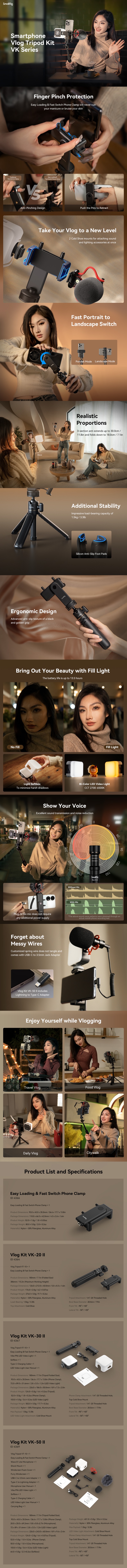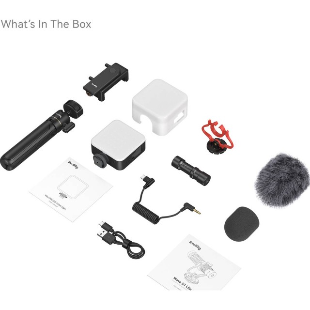 Sada SmallRig Smartphone Vlog Tripod Kit VK-50 Advanced Version 4369 se skládá ze stolního teleskopického stativu, držáku pro chytrý telefon Easy Loading, mikrofonu Wave S1 Lite na fotoaparátu, LED videosvětla Vibe P96 a softboxu. Tato kompaktní a přenosná sada má působivou nosnost 1,5 kg / 3,3 lb. Jedním šroubem 1/4"-20 se stativ připevňuje k držáku smartphonu, který je vybaven jedinečnou snadno zasouvatelnou konstrukcí pro rychlé připevnění a odejmutí smartphonu. Otáčení rukojeti o 360 stupňů umožňuje bezpečné a rychlé přepínání mezi orientací na výšku a na šířku, zatímco dvojice úchytů cold shoe umožňuje připevnění kompatibilního příslušenství. Kromě toho je LED videosvětlo dodáváno se třemi úchyty cold shoe, které umožňují připevnění dalšího příslušenství. Má TK 2700-6500K a výdrž baterie až 13,5 hodiny. Stativ lze složit na pouhých 16 cm / 6,3 palce. Mikrofon Shotgun s 3,5mm (0,13in) kabelem na Type-C (dodává se také s adaptérem Type-C na Lightning) pro nezastavitelný zážitek.