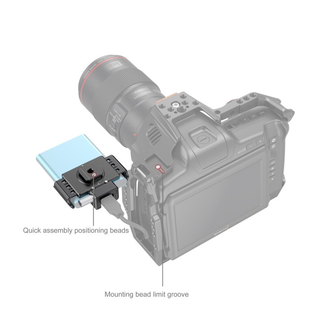 Montážní rámeček pro SSD disky T5/T7 a kamerovou klec SmallRig 3270 pro BMPCC 6K Pro. Upevňuje se do bleskové patice na levé horní straně klece nebo do závitu 1/4"-20 (šroub je součástí balení). Díky gumovým podložkám nedochází k poškrábání disku, nechybí ani kleština pro USB kabel, kterou lze snadno utáhnout/povolit rukou. Váha 41 g ±5 g.
