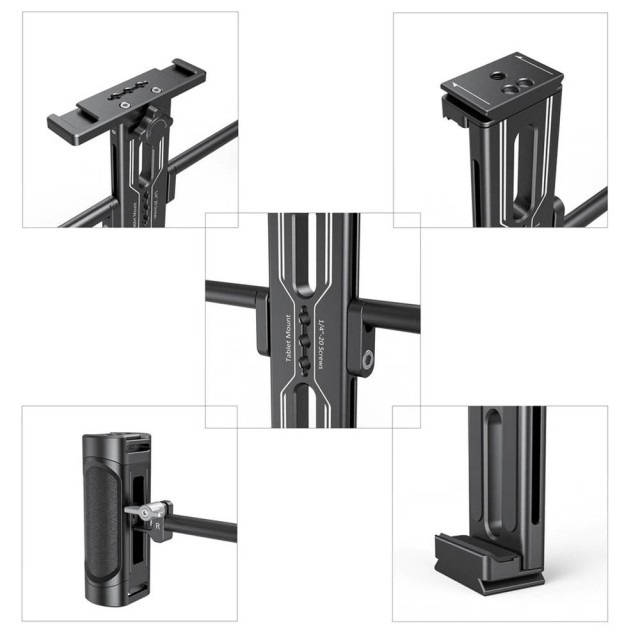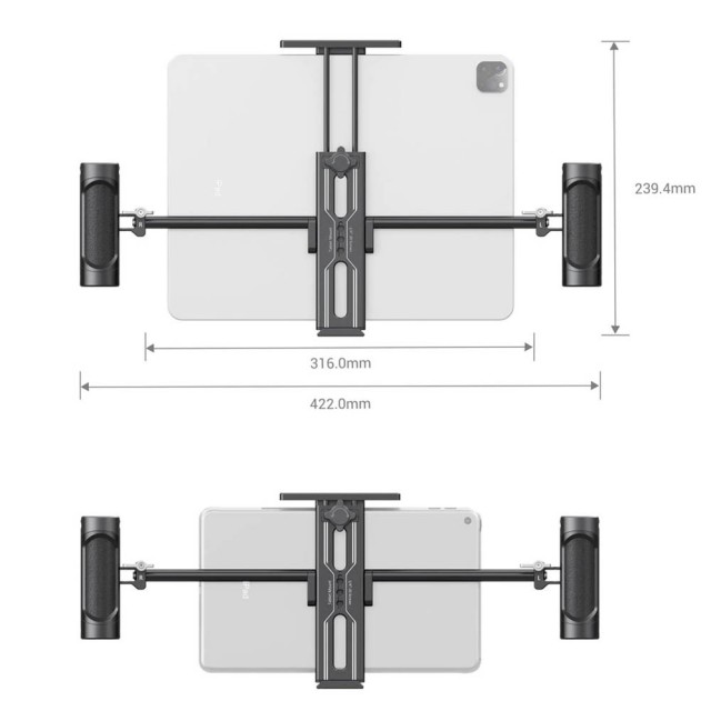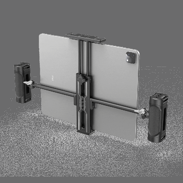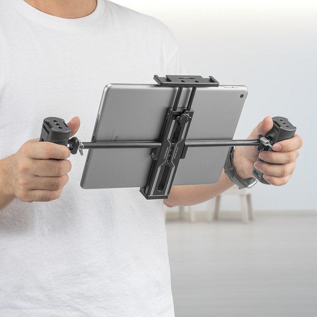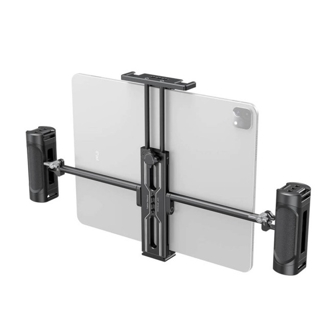 Držák SmallRig na tablet s dvojitým držadlem pro iPad 2929B je navržen tak, aby usnadnil montáž iPadu nebo tabletu a jeho použití jako monitoru pro režiséra. Je kompatibilní s iPadem o úhlopříčce 7,9" až 12,9" nebo jinými tablety podobné velikosti, a to s ochranným pouzdrem nebo bez něj. Zabudované gumové podložky zabrání poškrábání iPadu. Je vybaven dvěma odnímatelnými držadly, která jsou volně nastavitelná pro pohodlnější používání z ruky. Očka na popruhy na rukojetích umožňují připevnit popruh na ruku nebo popruh přes rameno. Dodává se s podstavcem ve stylu Arca-Swiss s otvorem se závitem 1/4 pro rychlou montáž/demontáž stativu. Je také vybaven několika otvory se závitem 1/4"-20 a dvěma úchyty pro studenou botku k připevnění dalšího příslušenství.