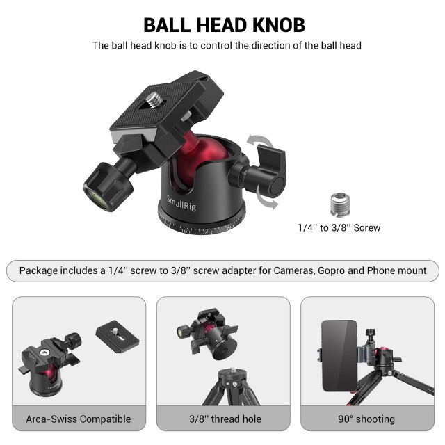 Stolní mini stativ SmallRig s panoramatickou kulovou hlavou BUT2664 je ideální mini stativ pro kompaktní digitální zrcadlovky, bezzrcadlovky, chytré telefony, akční kamery a další zařízení, který může sloužit i jako grip pro fotografování z ruky. Stativ bez kulové hlavy unese až 20 kg, zatímco samotná kulová hlava až 2 kg. Je pevný a bezpečný a gumové nožičky zaručují stabilní a neklouzavý základ na jakémkoli povrchu. Kulová hlava s přesnou kalibrací podporuje 360° panoramatické otáčení pro panoramatické snímání, -90°/+45° přední náklon a -50°/+50° boční náklon pro nastavení více úhlů včetně horizontálního a vertikálního snímání. Dodává se se standardní destičkou Arca-Swiss, která je kompatibilní s dalšími svorkami Arca-Swiss a zajišťuje rychlou montáž/demontáž zařízení.