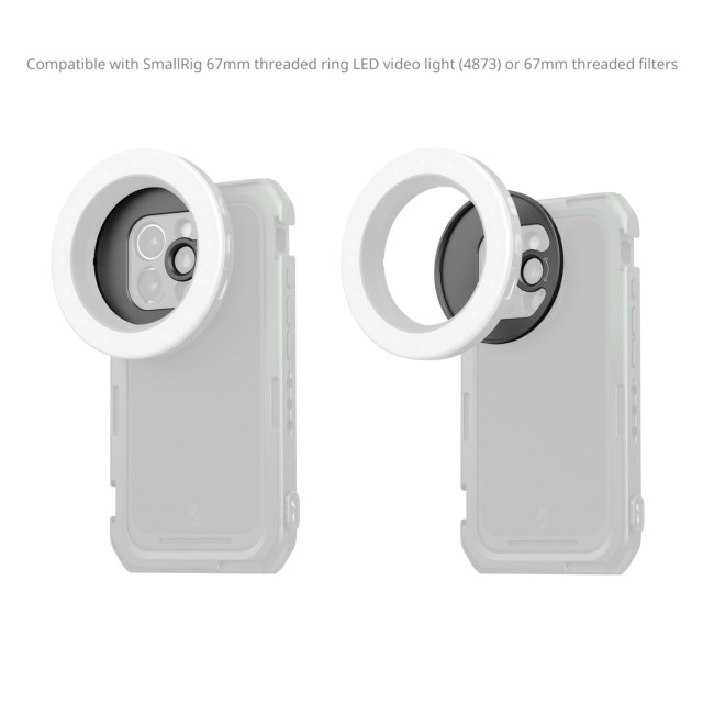 1. Usnadňuje připevnění filtrů se závitem 67 mm nebo kruhových LED videosvětel SmallRig se závitem 67 mm ke klecím na telefony T-Mount nebo zadním deskám objektivů.