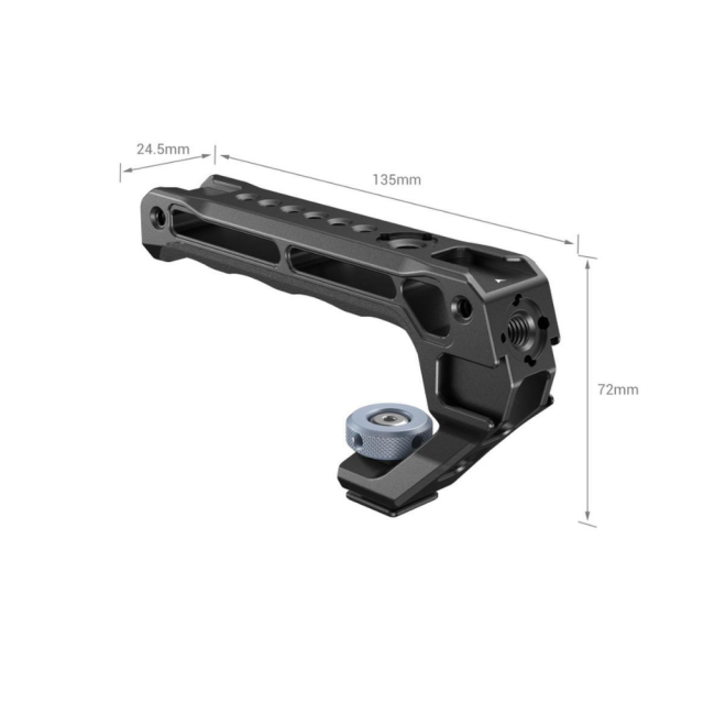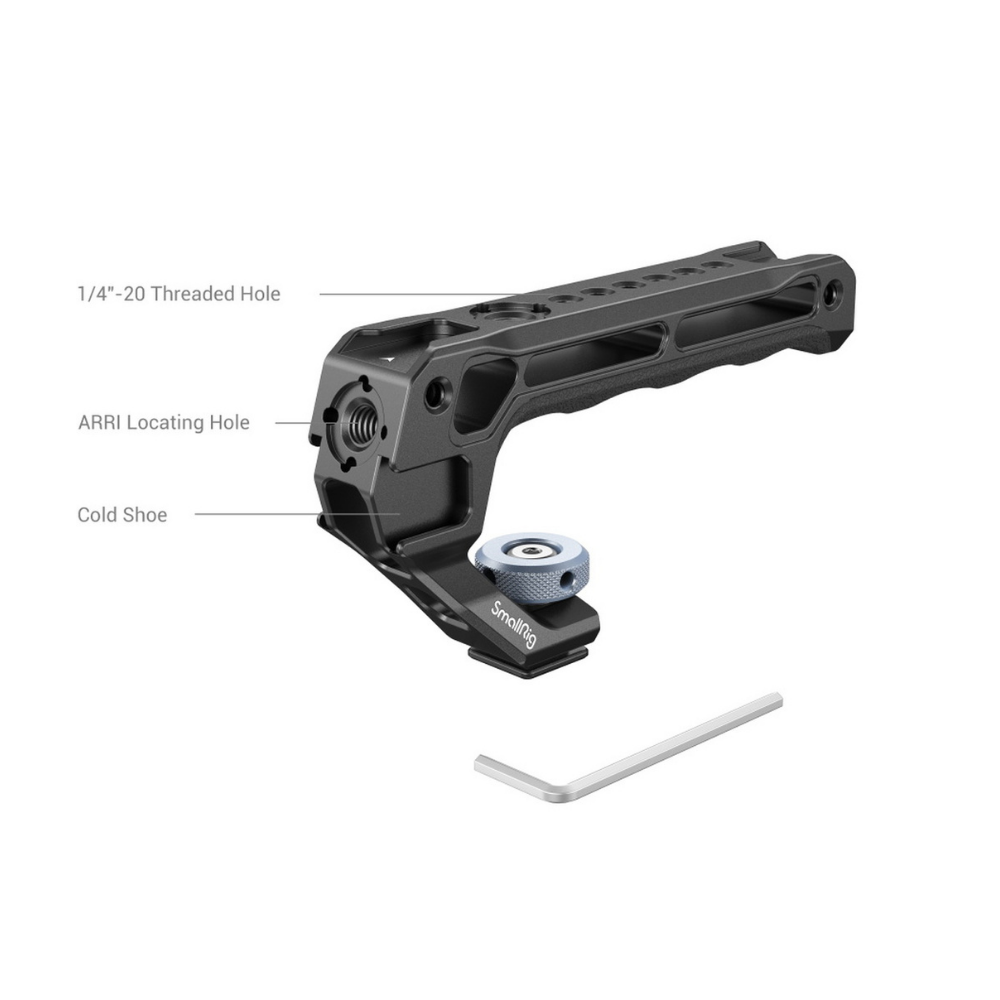Horní rukojeť s cold shoe 3764 je navržena tak, aby usnadňovala záběry z nízkého úhlu a snižovala namáhání rukou. Ergonomická rukojeť s protiskluzovým silikonem je pohodlná a díky duté konstrukci váží pouhých 129 g. Má 3 přední a 2 zadní cold shoes, které umožňují současnou montáž mikrofonu, světla LED, monitoru a dalšího příslušenství. Polohovací otvory ARRI 3/8"-16 podporují držák monitoru 2903, 2348 pro montáž monitorů; otvory se závitem 1/4"-20 podporují rameno Magic Arm 2070 pro monitory a dálkové ovládání 2924 pro nahrávání. K utažení zajišťovacího šroubu slouží imbusový klíč, který usnadňuje montáž a demontáž.