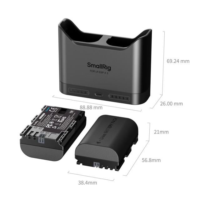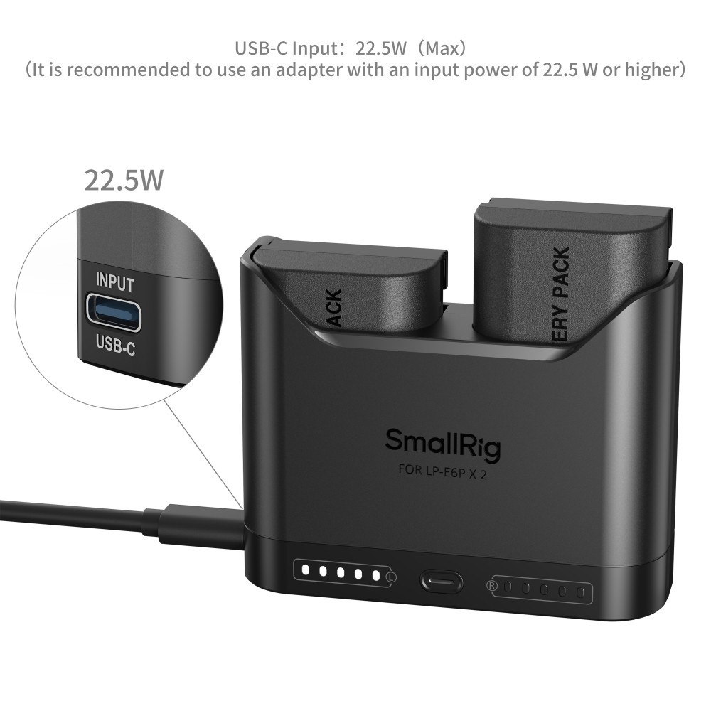Sada SmallRig Turbo Charging Kit pro baterie LP-E6NH do fotoaparátů 5484 obsahuje dvě vysoce výkonné baterie a dvoukanálovou rychlonabíječku. Díky plně dekódovacímu čipu zajišťuje tato sada plnou kompatibilitu s bateriemi Canon LP-E6NH, eliminuje vyskakovací varování a podporuje zobrazení stavu nabití v fotoaparátu i použití originální nabíječky.