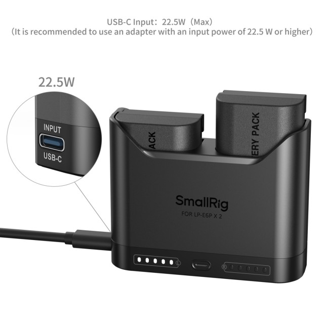 Sada SmallRig Turbo Charging Kit pro baterie LP-E6P 5485 obsahuje dvě vysoce výkonné baterie a dvoukanálovou rychlonabíječku. Díky čipu pro plné dekódování zajišťuje tato sada plnou kompatibilitu s bateriemi Canon LP-E6P a podporuje fotoaparáty jako EOS R5 II. Eliminuje vyskakovací varování a zároveň zachovává zobrazení stavu nabití v fotoaparátu a kompatibilitu s originálními nabíječkami Canon.