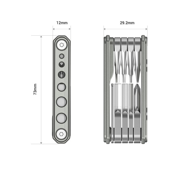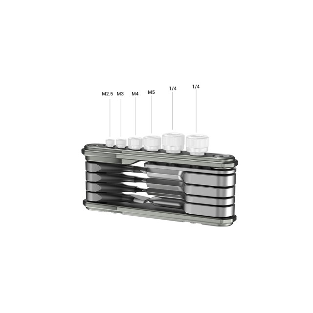 Univerzální skládací multifunkční nářadí SmallRig pro videografy TC2713 kombinuje 9 rozkládacích nástrojů užitečných pro videografy s úložnými otvory se závitem, abyste měli šrouby vždy po ruce. Toto multifunkční nářadí, vyrobené z nástrojů z nerezové oceli a hliníkového pouzdra, se skládá z širokého a úzkého plochého šroubováku, křížového šroubováku PH1 a šroubováku H1.5、H2.0、H2.5、H3.0、H4.0、3/16