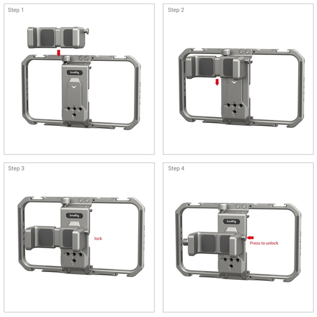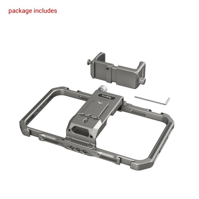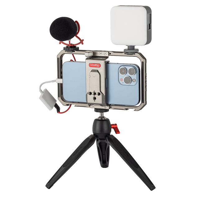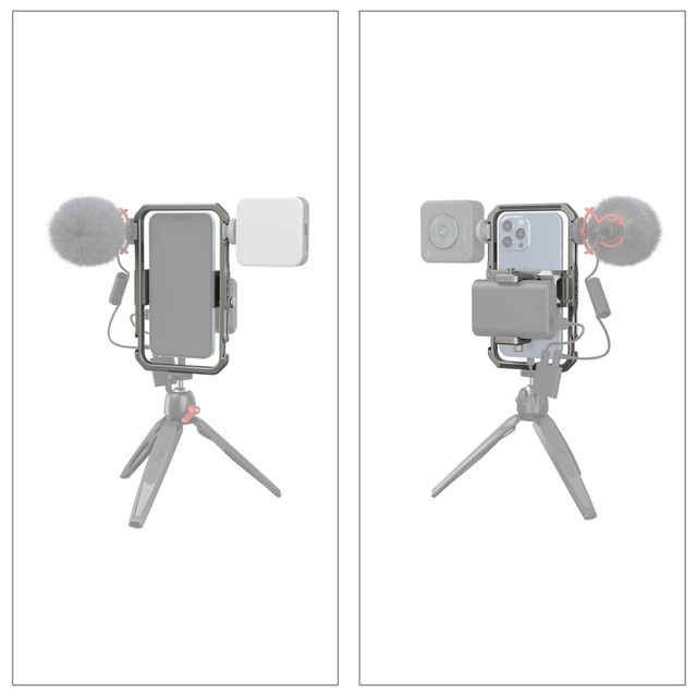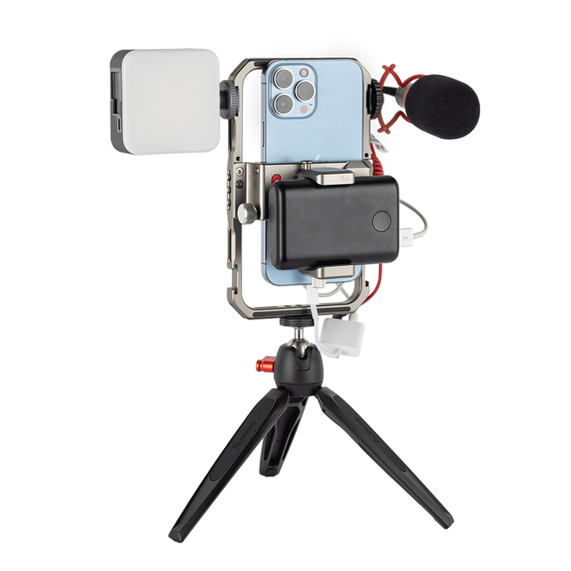 SmallRig Universal Lite Video Kit pro iPhone řady 3611 je kompaktní multifunkční sada určená pro profesionální videografii, živé vysílání a vlogování. Dodává se s otvory 1/4"-20 se závitem proti pootočení a s příslušenstvím pro cold shoe, jako je boční rukojeť 2772, stativ BUT2429, mikrofon 3452 a světlo LED 3286; jeho zadní část je vybavena magnetickým rychloupínacím designem pro bezpečné upevnění držáku powerbanky, což představuje kompletní řešení napájení pro natáčení mobilním telefonem. Držák chytrého telefonu lze přesně nastavit vlevo a vpravo, aby nebránil blokování tlačítek, rozdělená konstrukce neruší signál mobilního telefonu a vestavěné podložky pomáhají zvýšit stabilitu a zabraňují poškrábání. Telefon po nasazení na klec umožňuje horizontální i vertikální snímání.