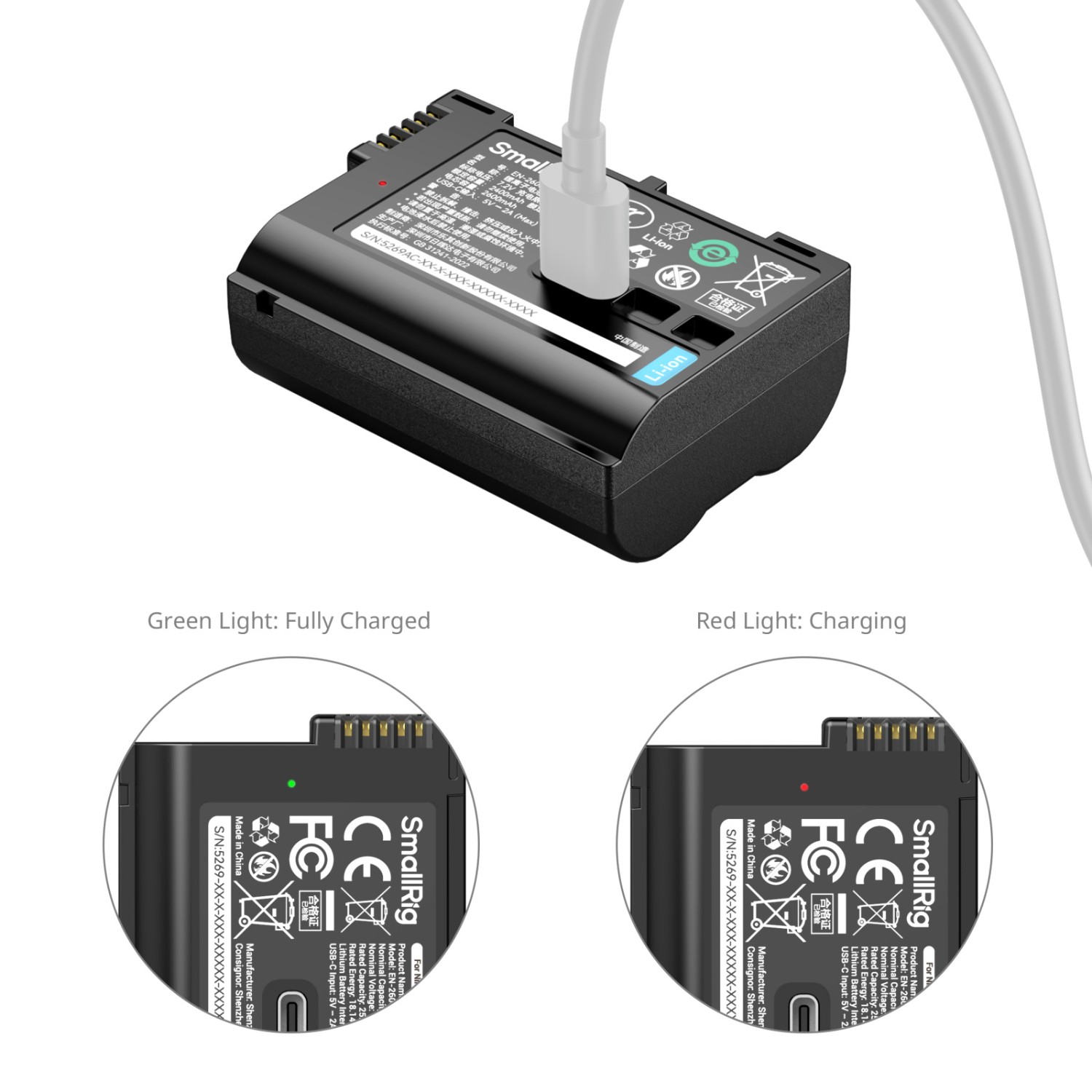 Vestavěný nabíjecí port USB-C umožňuje přímé nabíjení z powerbank, síťových adaptérů, autonabíječek nebo prodlužovacích kabelů, takže není potřeba speciální nabíječka. Baterie podporuje vstup 5 V/2 A a dosáhne plného nabití přibližně za 2,5 hodiny. Baterie SmallRig EN-EL15c je uložena v lehkém, ohnivzdorném plastovém pouzdře s odolným designem a obsahuje nabíjecí kabel USB-A na USB-C a ochranný kryt kontaktů, díky čemuž je ideální pro cestování, studio i použití v terénu.
