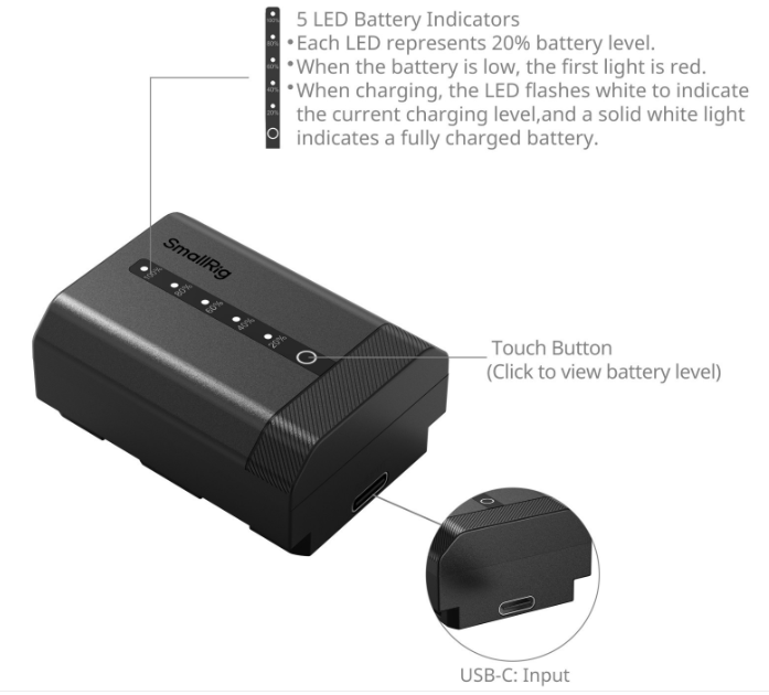 Je vybavena portem USB-C, takže ji lze nabíjet z powerbank, síťových adaptérů, autonabíječek nebo speciálních nabíječek a dosáhnout plného nabití za pouhé 2,5 hodiny přes vstup 5 V/2 A. Plně dekódovaný čip zajišťuje bezproblémovou kompatibilitu s fotoaparáty Sony a zabraňuje zobrazování vyskakovacích varování nebo chyb. Je uložena v prémiovém plášti z ABS+PC s matným povrchem, který je odolný proti hoření, odolný vůči teplu a ergonomicky navržený tak, aby se pohodlně vešel do přihrádek fotoaparátu.