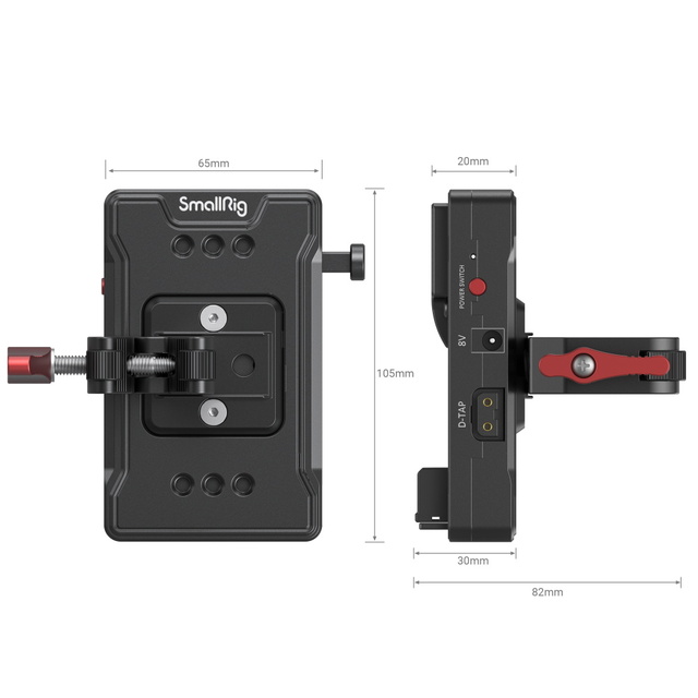 Adaptérová deska SmallRig V Mount Battery Plate (základní verze) se svorkou (ve tvaru kraba) 3497 je navržena tak, aby poskytovala větší výdrž baterie pro vaši kamerovou sestavu prostřednictvím baterie V Mount. Jeho standardní rychloupínací držák V podporuje většinu baterií V mount. Výstupní porty včetně portu 8 V DC, portu 12 V DC a dvou portů 14,8 V D-Tap pracují s baterií pro napájení fotoaparátu a dalších zařízení (např. monitoru, vysílače, follow focusu, mobilního telefonu atd.).) Je vybaven přepínačem napájení, který rychle a pohodlně ovládá všechny výstupní porty, a dodává se s držákem super clamp, který se hodí pro tyče o průměru 15 až 30 mm a pomáhá připevnit baterii V-mount na stativ, světelný stojan nebo ruční kroužek pro gimbaly. Kromě toho můžete díky několika otvorům se závitem 1/4"-20 připojit další příslušenství, například dvojitou svorku na tyč a magic arrm rameno.