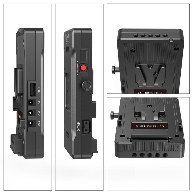 Adaptérová deska SmallRig V Mount Battery Plate s dvojitou 15mm tyčovou svorkou 3203 je navržena tak, aby poskytovala větší výdrž baterie pro vaši kamerovou sestavu prostřednictvím baterie s V mountem. Deska využívající standardní Vmount je vhodná pro většinu baterií s Vmountem. Poskytuje výstupní port 8 V DC, dva výstupní porty 12 V DC, výstupní port 14,8 V D-Tap a výstupní port 5 V/2 A USB pro napájení fotoaparátu nebo kamery a dalšího externího příslušenství, jako je monitor, telefon atd. prostřednictvím baterie. Je vybaven vypínačem, který ovládá všechny výstupní porty pro rychlejší a pohodlnější zapnutí nebo vypnutí vaší sestavy. Dodává se s dvojitou 15mm tyčovou svorkou, která pomáhá připevnit desku k vašemu 15mm tyčovému systému LWS, a s několika otvory se závitem 1/4"-20 na zadní straně, nahoře a dole pro připojení dvojité tyčové svorky, magického ramene nebo jiného příslušenství.