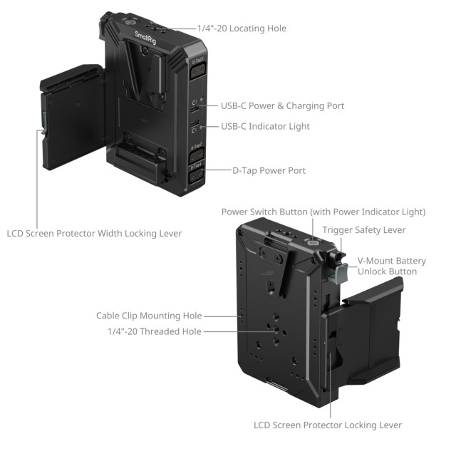 Modulární ochrana LCD displeje umožňuje nastavení výšky a šířky bez použití nástrojů a je vhodná pro většinu bezzrcadlovek s výklopným displejem, přičemž poskytuje ochranu proti nárazům. Deska V-mount je vybavena několika závitovými a polohovacími otvory 1/4"-20, které usnadňují připevnění příslušenství, jako jsou magická ramena (ID 3238B / 3873) pro bezdrátové vysílače a profesionální sestavy.
