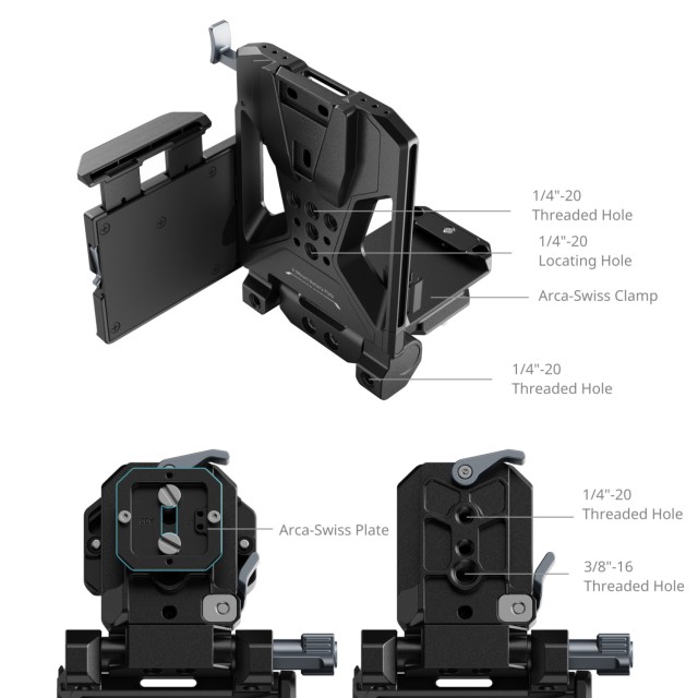 Odnímatelná rychloupínací destička Arca-Swiss navíc usnadňuje rychlé přechody mezi režimy fotografování z ruky a ze stativu. Po sejmutí se na ní objeví otvory se závity 1/4"-20 a 3/8"-16 pro alternativní řešení montáže. Deska V-mount je vybavena několika závitovými otvory 1/4"-20 a 1/4"-20, které umožňují připevnění příslušenství, jako jsou magická ramena (ID 3238B / 3873) pro bezdrátové vysílače a profesionální sestavy.