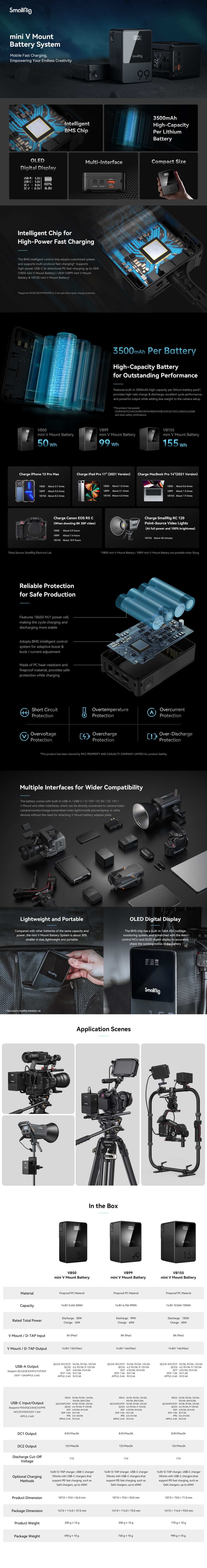 Smallrig Baterie VB50 mini V Mount je přibližně o 70 % menší než běžná baterie V Mount díky vysoce integrované konstrukci, která zabírá méně místa, takže je lehčí a přenosnější! Vysoce integrovaný (čip rychlého nabíjecího protokolu + MCU + řízení zvýšení napětí) čip BMS podporuje širokou škálu hlavních protokolů rychlého nabíjení (PD/QC/SCP/PPS/APPLE-2,4A atd.), obousměrný 45W (max.) Rychlé nabíjení USB-C PD, stejně jako adaptivní zvýšení napětí/adaptivní regulace proudu atd. Kromě toho jeho přizpůsobená inteligentní BMS zajišťuje rychlejší a bezpečnější nabíjení tím, že poskytuje několikanásobnou ochranu proti nadproudu/zkratu/přehřátí/přepětí atd. Součástí jsou také rozhraní jako USB-A / USB-C / D-tap / DC 8V / DC 12V / V Mount pro efektivní nabíjení / napájení fotoaparátu / videokamery / monitoru / bezdrátového video vysílače / video světla / mobilního telefonu / notebooku atd. bez použití V-mount desky pro konverzi! Čip BMS je vybaven 16bitovým algoritmem ADC/metrem spotřeby spolu s MCU a digitálním displejem OLED, který vás neustále informuje o stavu baterie. Vestavěná prémiová vysoce výkonná baterie (bez nadměrné kapacity), která je dobíjecí a stabilní, splňuje normy MSDS/UN38.3/IEC62133/UL2054/UL62368 a další mezinárodně uznávané normy, což vám umožní zachytit každý okamžik bez námahy!