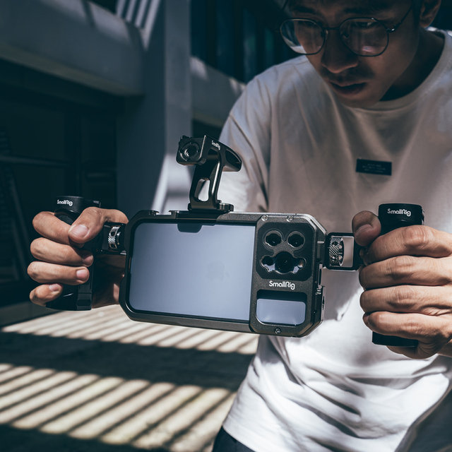 Sada SmallRig Video Kit Lite pro iPhone 13 Pro Max 3604 má dvě rukojeti pro stabilní natáčení a vlogování. Je vybaven otvory se závitem 1/4"-20 proti pootočení a cold shoes pro podporu příslušenství, jako je stativ BUT2429, mikrofon 3452 a světlo LED 3286, atd. Podporuje objektivy s bajonetem M nebo 17mm závitem po výměně zadní desky. Dutá konstrukce umožňuje přístup k tlačítkům, portům, radaru a ultraširokoúhlému objektivu iPhonu. Kovová plná klec se zabudovanými podložkami zabraňuje poškrábání a snižuje vibrace. Klec umožňuje horizontální i vertikální snímání.