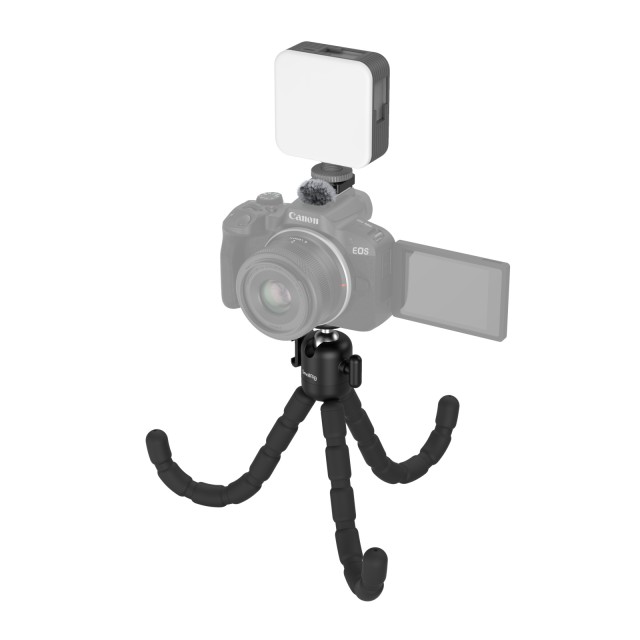 Stativ se zajišťuje pomocí vestavěného šroubu 1/4"-20 a je vybaven flexibilními nohami a kulovou hlavou, vhodnou pro různé scény a snímání z více úhlů. A přenosné LED video světlo lze upevnit do horní části chlupatého předního skla prostřednictvím studené botky. Jeho nastavitelná teplota barev a jas, stejně jako 100minutová výdrž baterie, mohou plně uspokojit vaše nároky na každodenní natáčení.