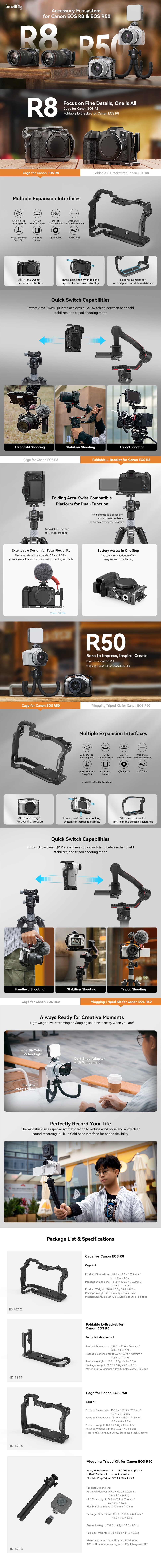 Stativ SmallRig Vlogging Tripod Kit pro Canon EOS R50 4213 je navržen tak, aby poskytoval lehké a zároveň přenosné řešení pro natáčení Vlogů pro tvůrce obsahu. Je ideální pro dosažení vysoce kvalitního záznamu, super stabilního natáčení z ruky a snadného nastavení barev pro postprodukci, obsahuje chlupaté větrné sklo, flexibilní stativ a LED video světlo. Mezi nimi je chlupaté čelní sklo vybaveno speciální polyesterovou vlnou a konstrukcí se zesílenou podšívkou pro snížení hluku větru při natáčení venku. Bezpečně se upevňuje na hot shoe pomocí adaptéru cold shoe, který má ve spodní části ochranné silikonové podložky a držák cold shoe pro LED video světlo, mikrofon atd.