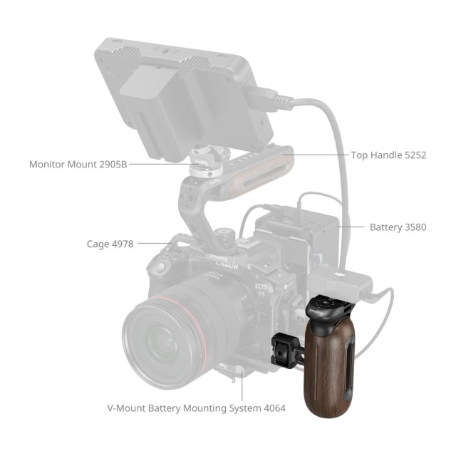 Boční rukojeť je nahoře vybavena držákem cold shoe pro mikrofony nebo světla a polohovacím otvorem 1/4"-20 pro různé příslušenství, jako jsou magická ramena a držáky monitorů (ID 4886). Kromě toho nabízí 29mm / 1,14in vertikální nastavení pro optimálně vyvážené ovládání.