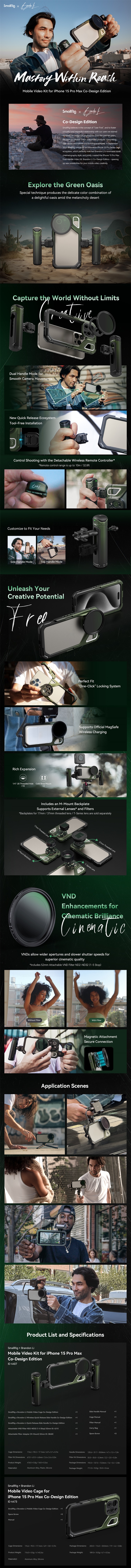 SmallRig x Brandon Li Mobile Video Kit pro iPhone 15 Pro Max Co-design Edition 4407 obsahuje dvě rukojeti pro zajištění stabilního natáčení videa a vlogování; bezdrátové ovládání umožňuje natáčení "jedním kliknutím". Klec má několik otvorů se závitem 1/4"-20 a studené patky pro upevnění rukojeti, stativu, mikrofonu, LED videosvětla atd. Všechny jsou vybaveny novým rychloupínacím ekosystémem SmallRig pro snadné a okamžité přepínání mezi natáčením v horizontální a vertikální orientaci. Zejména klec je decentně vyhloubená, aby umožnila plný přístup k tlačítkům, portům, radaru a ultraširokoúhlému objektivu iPhonu a k bezdrátové nabíječce MagSafe. Jako celokovová plná klec je také vybavena vestavěnými podložkami, které zabraňují nárazům a poškrábání. Součástí sady je také adaptér s kroužkem na filtry a VND filtr ND2-ND32 (5 stupňů), díky kterému je obraz plynulejší a filmovější. Kromě toho vám speciální barva a výrobní proces i znamenitý podpis Brandona Li nepochybně dodají jedinečný pocit exkluzivity.