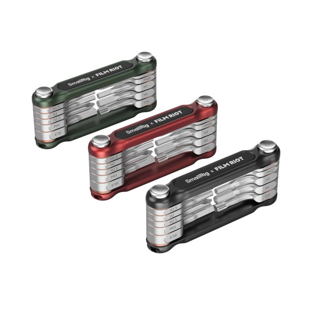 SmallRig x FILM RIOT Sada skládacích klíčů 10 v 1 s možností nastavení více úhlů (zelená) 4814 je navržena speciálně pro tvůrce fotografií a videí. Sada 10 v 1 má skládací konstrukci, která zajišťuje přenosnost a pohodlí a pokrývá běžné velikosti klíčů ve foto a video průmyslu. Díky exkluzivnímu patentovanému konstrukčnímu řešení lze každý klíč bezpečně polohovat v úhlu 90° nebo 180°, což usnadňuje efektivní montáž a demontáž příslušenství před a po natáčení. Sada je opatřena protiskluzovým silikonovým povrchem pro pohodlný úchop. Tato sada klíčů je vyrobena z hliníkové slitiny a nerezové oceli a zaručuje odolnost a spolehlivost.