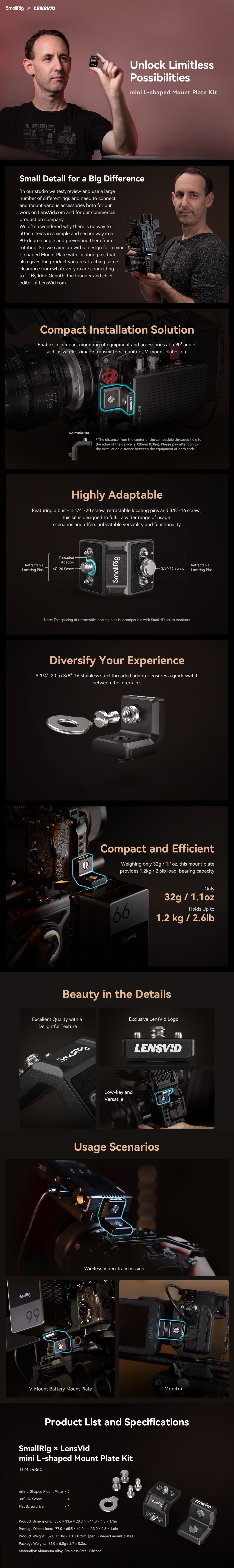 SmallRig x LensVid mini L-Shaped Mount Plate Kit MD4360 je navržen Iddo Genuthem, spoluzakladatelem a redaktorem LensVid.com, webové stránky o fotografování a videu, která funguje již 10 let, a programu SmallRig DreamRig. Tato sada poskytuje kompaktnější řešení pro montáž zařízení a příslušenství, jako jsou bezdrátové vysílače obrazu, monitory, desky s V-mountem atd. pod úhlem 90° k fotoaparátu. Dodává se také se čtyřmi montážními řešeními: 1/4"-20 šroub, polohovací šroub 1/4"-20, šroub 3/8"-16 a polohovací otvor ARRI 3/8''-16, aby naši uživatelé mohli splnit více scénářů použití. Zařízení má zabudovanou protiskluzovou silikonovou podložku, která chrání kameru před poškrábáním a zajišťuje bezpečné upevnění. Nosnost 1,2 kg/2,6 lb je kompatibilní s většinou bezdrátových vysílačů obrazu a příslušenství.