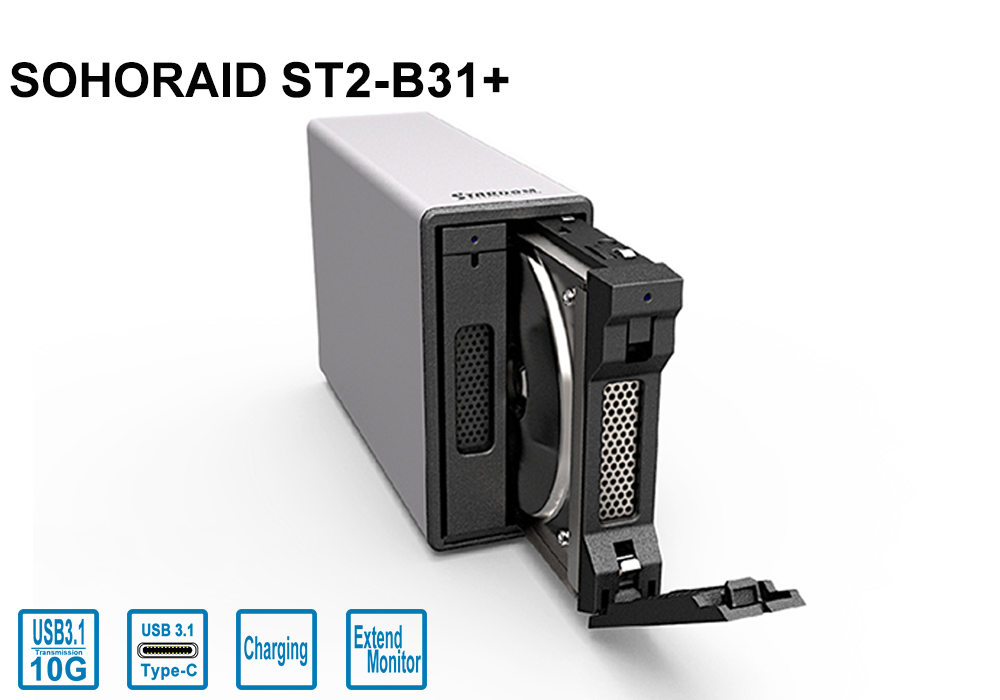 Stardom SOHORAID ST2-B31+ je desktopové RAID řešení využívající rychlé rozhraní USB 3.1 Gen 2 Type C pro přenosové rychlosti až 10 Gb/s. Hliníkové šasi podporuje dva 3,5” i 2,5” SATA HDD/SSD disky a je vybaveno hardwarovou RAID podporou (RAID 1 / RAID 0 / JBOD / BIG), Mini DisplayPortem (DP1.1a) pro připojení displejů (až 4K@30Hz; DVI, HDMI a VGA pomocí redukcí), či možností napájení např. notebooků v režimu USB PD (Power Delivery) 15W (5V/3A), 18W (9V/2A) a 24W (12V/2A).