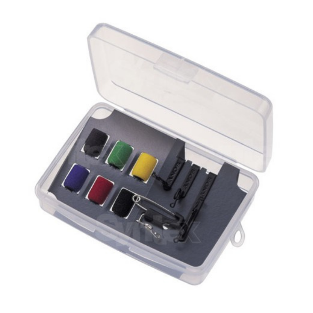 Obsah balenia: Sada obsahuje štyri typy mikrofónových klipov (jednoduchý/horizontálny, jednoduchý/vertikálny, dvojitý/horizontálny a klip s bezpečnostným kolíkom) a šesť uretánových predných skiel (červené, žlté, zelené, modré, sivé a čierne).