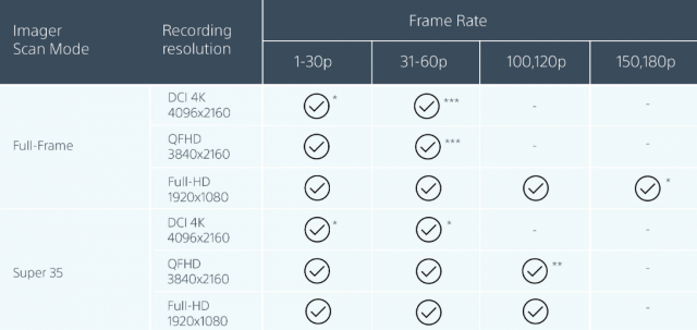 XAVC-I QFHD mode: 3840 x 2160/59.94P, 50P, 29.97P, 23.98P, 25P