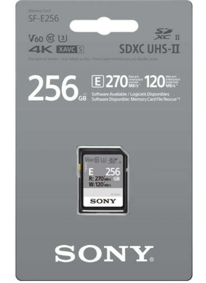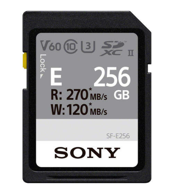 Paměťová karta Sony SDXC SF-E 256 GB UHS-II V60 nabízí vysoký výkon s rychlostí čtení až 270 MB/s a rychlostí zápisu až 120 MB/s, což je ideální pro natáčení videa v rozlišení 4K a vysokorychlostní fotografování.