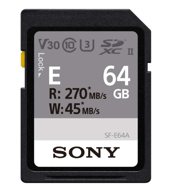 Paměťová karta Sony SDXC 64 GB řady SF-E s rozhraním UHS-II nabízí vysoký výkon pro fotografování i natáčení videa, podporuje záznam v rozlišení 4K, sériové snímání a spolehlivý vysokorychlostní přenos dat.
