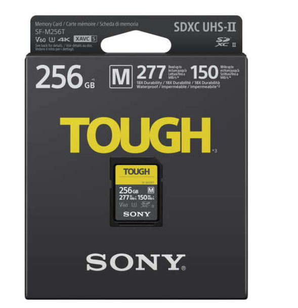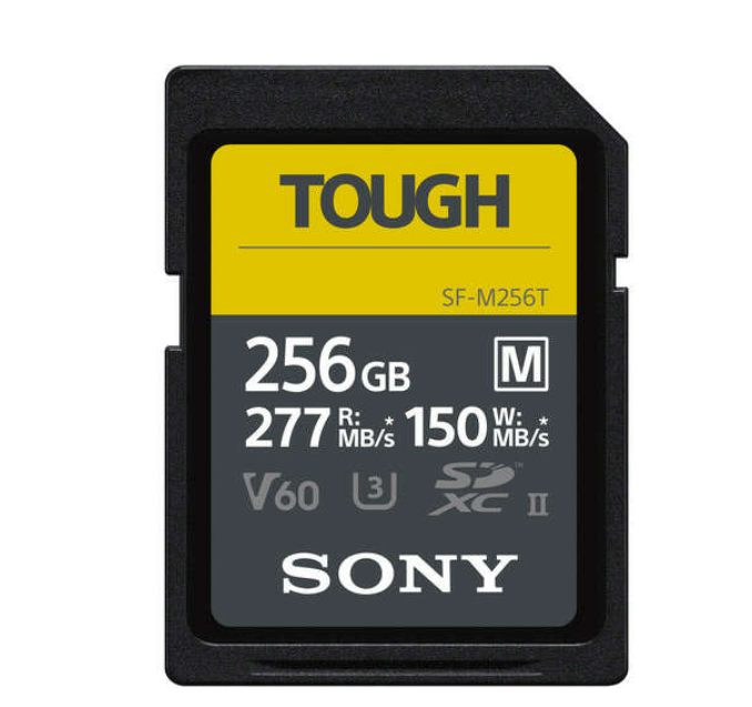 Paměťová karta Sony SDXC Tough SF-M 256 GB V60 UHS-II nabízí vysokou rychlost a mimořádnou odolnost a je určena pro profesionální záznam videa v rozlišení 4K/8K a sériové snímání v náročných podmínkách.