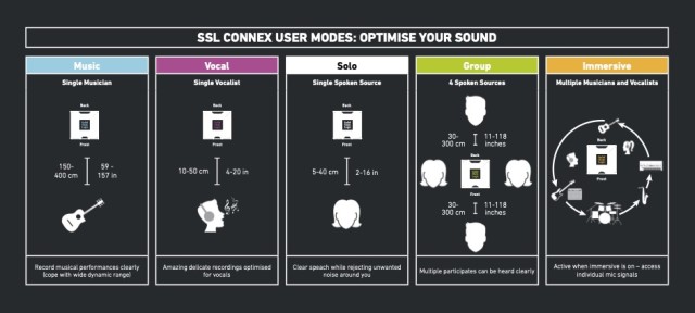 SSL CONNEX je vybaven pokročilou soustavou čtyř mikrofonů se čtyřmi speciálně definovanými uživatelskými režimy, které vám zajistí skvělý zvuk v jakémkoli scénáři. Všechny čtyři režimy jsou vybaveny pokročilým nastavením pohlcujícího záznamu. To vám umožňuje přistupovat ke každému ze čtyř jednotlivých mikrofonních zdrojů za účelem pohlcujícího a prostorového nahrávání nebo vysílání.