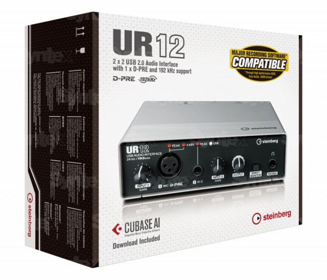 Profesionální externí zvukovka UR12 je určena především pro nezávislé umělce nebo pro mobilní nahrávání, kde i přes svou cenovou dostupnost poskytne špičkovou zvukovou kvalitu a dostačující sadu funkcí. Podporuje vzorkování s frekvencí až 192 kHz, nabízí vynikající dílenské zpracování i elektroniku a také podporu pro iPady. Na čelním panelu naleznete konektor Neutrik XLR pro připojení mikrofonu, za který je zařazen kvalitní předzesilovač Yamaha D-PRE se zapojením ve třídě A a s fantomovým napájením. Druhý kanál je realizován jako vysokoimpedanční jack pro připojení hudebních nástrojů, např. elektrických kytar. Každý kanál nabízí nezávislou změnu zisku a indikátor špiček, samozřejmostí je sluchátkový výstup, regulátor výstupní úrovně signálu, a také přepínač Direct Monitor pro bezlatenční propojení vstupů s výstupy. Zadní panel je osazen analogovými výstupy s konektory RCA/Cinch, jedním portem USB 2.0 a jedním portem mini USB pro připojení volitelného napáječe. V ceně je licence programu Cubase AI.