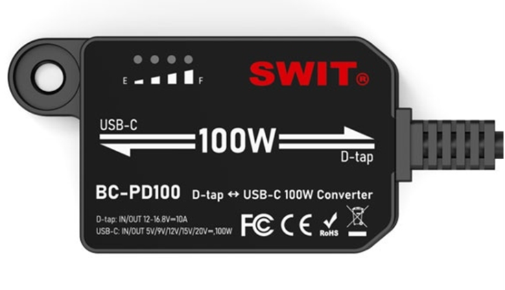 SWIT BC-PD100 je obousměrný převodník D-tap na USB-C 100W PD, který vylepšuje jakoukoli baterii fotoaparátu s výstupem D-tap pro napájení zařízení USB-C nebo nabíjení baterií přes USB-C, což je ideální pro profesionální pracovní postupy na place.