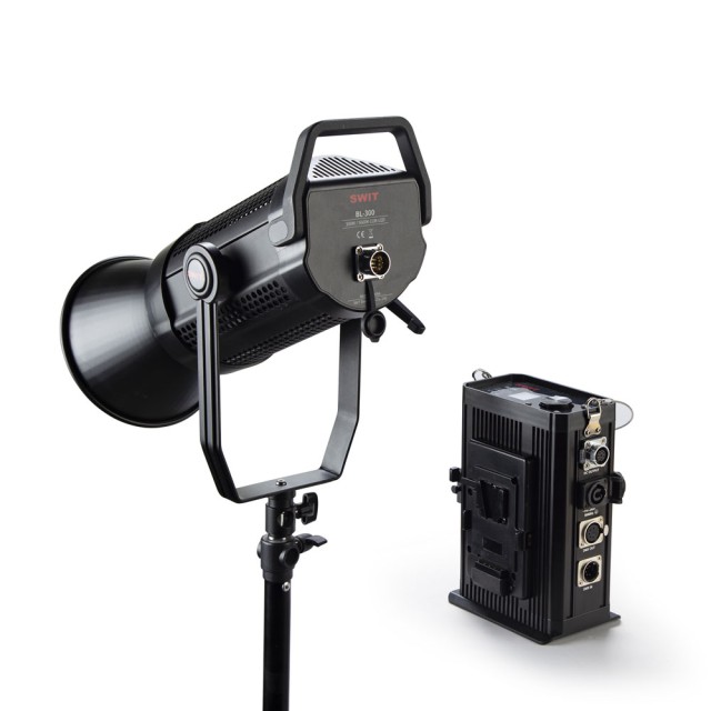BL-300 separates the control box to the light head, to enable power by batteries for outdoor lighting. The control box has PowerCON AC input, 2x V-mount battery plates, DC connector with light head, 5-pin DMX in & out, control buttons and LCD display.