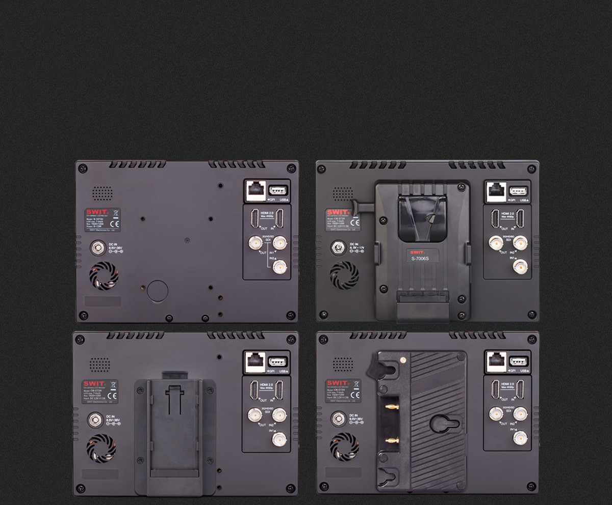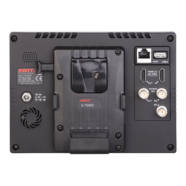 Monitor CM-S73H podporuje stejnosměrný vstup 6,5-17 V prostřednictvím 5,5mm uzamykatelné stejnosměrné zásuvky a k napájení lze instalovat bateriové desky SWIT S-7006 řady V-mount / Gold mount / DV.