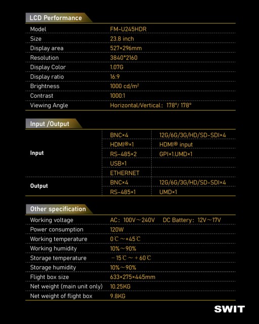 Tento 23,8palcový 4K HDR monitor pro terénní produkci je určen pro profesionální použití a nabízí jasný displej s jasem 1000 nitů pro jasné zobrazení na slunci. Je vybaven rozsáhlými video rozhraními, včetně Quad 12GSDI a HDMI 2.0, což z něj činí ideální řešení pro terénní produkci z více zdrojů. Monitor je dodáván připravený k použití s přepravním kufrem a nezbytným příslušenstvím.