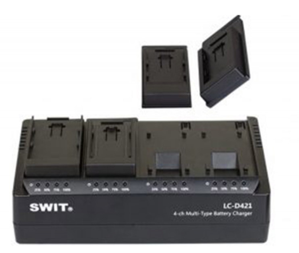 SWIT LC-D421V KIT je profesionální 4kanálová nabíječka DV baterií dodávaná se 4× deskami typu JVC BN-VF. Díky výstupu 2 A na kanál a LED indikátorům nabíjení dokáže nabít až čtyři DV baterie současně za přibližně jednu hodinu.