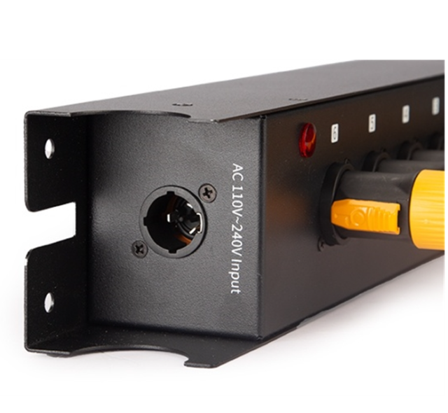 Rozvodná skříň SWIT PA-J416 1-to-4 poskytuje stabilní a efektivní řešení pro rozvod elektrické energie v osvětlovacích zařízeních, zejména pro televizní stanice, divadla, studia a živé vysílací místnosti. Díky vynikající tepelné izolaci, odolnosti proti nárazům a nehořlavosti zajišťuje jednotka bezpečnost a odolnost v náročných podmínkách. Kompaktní design rozvodné skříně odpovídá konstrukci instalačních držáků, což umožňuje pohodlné zavěšení na osvětlovací mřížky pomocí háčků na lampy. PA-J416 je vybaven 3žilovou 16A samosvornou leteckou zástrčkou a nabízí bezpečný a kontrolovatelný příkon s maximálním proudem 20 A a maximálním zatížením 3500 W. Zařízení podporuje široký rozsah vstupního napětí (110 V až 240 V, 50 Hz), díky čemuž je univerzální pro různé napájecí systémy. Kontrolka napájení vizuálně potvrzuje stav provozu, což zvyšuje bezpečnost a usnadňuje údržbu. Tento rozvaděč napájení efektivně spravuje více osvětlovacích kabelů, čímž snižuje nepořádek a zlepšuje pracovní postupy v různých profesionálních prostředích, jako jsou mediální centra, interview studia a panoramatická studia.