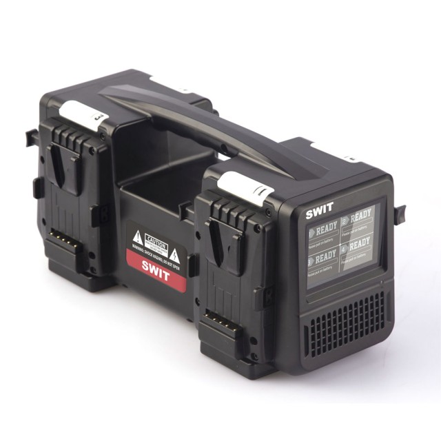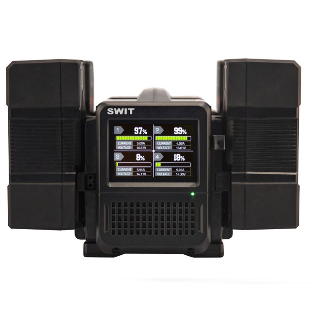 SWIT PC-P461S je plně simultánní 4-kanálová nabíječka 4x100W Super Fast V-mount s informačním LCD displejem pro zobrazení stavu nabíjení jednotlivých baterií.